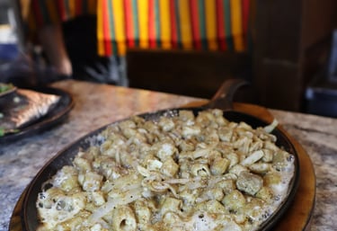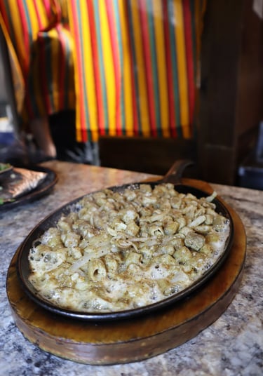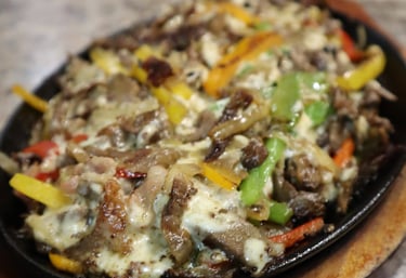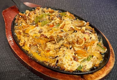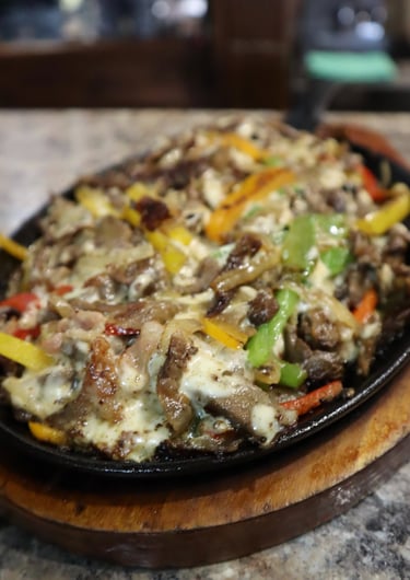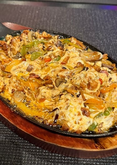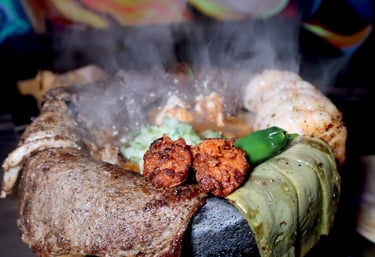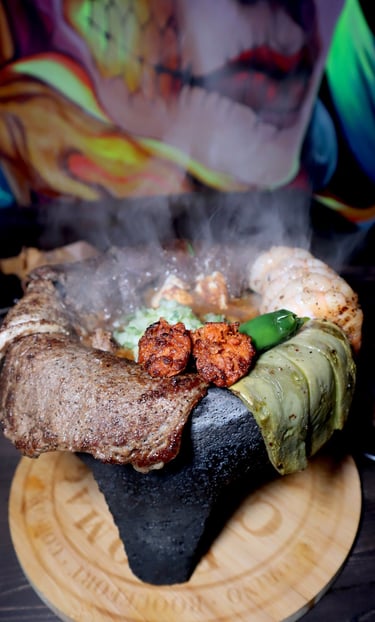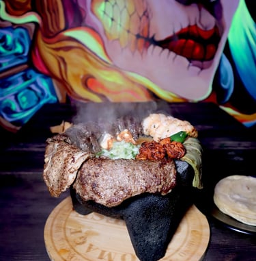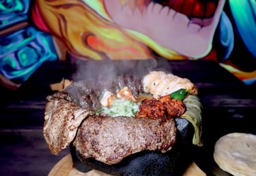 Boiling volcanic rock with porkchop, chorizo, skirt steak, top sirloin premium, shrimps, nopal, fresh cheese, grilled onion, grilled chili, house sauce with onion and cilantro & 8 corn tortillas on the side