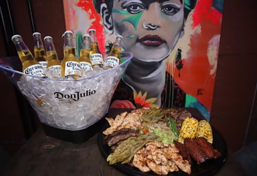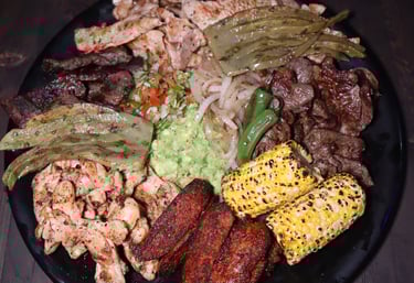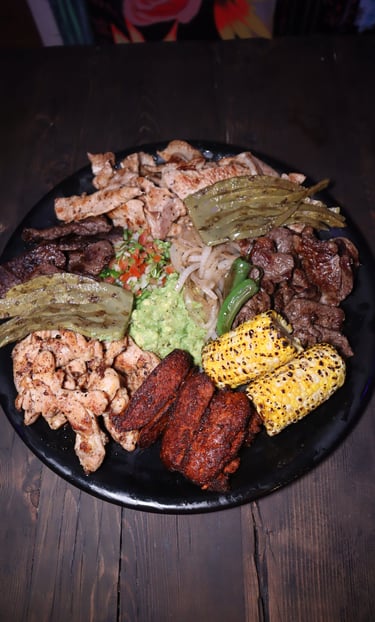 Great dish to share with chorizo, porkchop, chicken, top sirloin premium skirt steak, corn, nopal, grilled onions, pico de gallo, guacamole & 25 corn tortillas