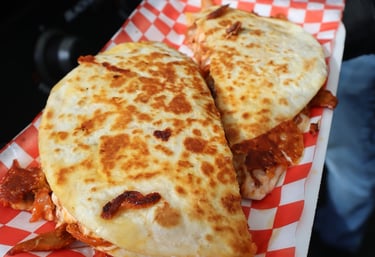 A mixed of bacon, mushrooms, melted mozza cheese, bell peppers, onion, the meat of your choice & 4 flour tortillas