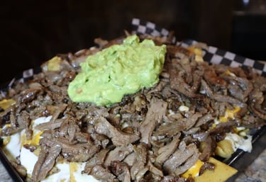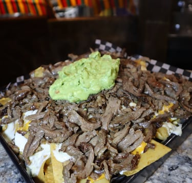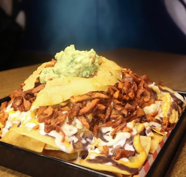 Tortilla chips, beans sauce, nachos cheese, sour cream, melted mozza cheese, guacamole mix & your choice of meat