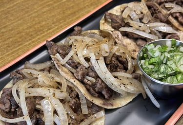 Beef guts fried with grilled onions & 5 corn tortillas on the side