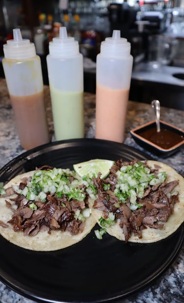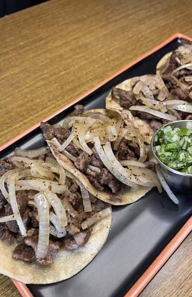4 Tacos of Bisteck, beans sauce, grilled onions, serrano chili, corn tortilla, cilantro & onion